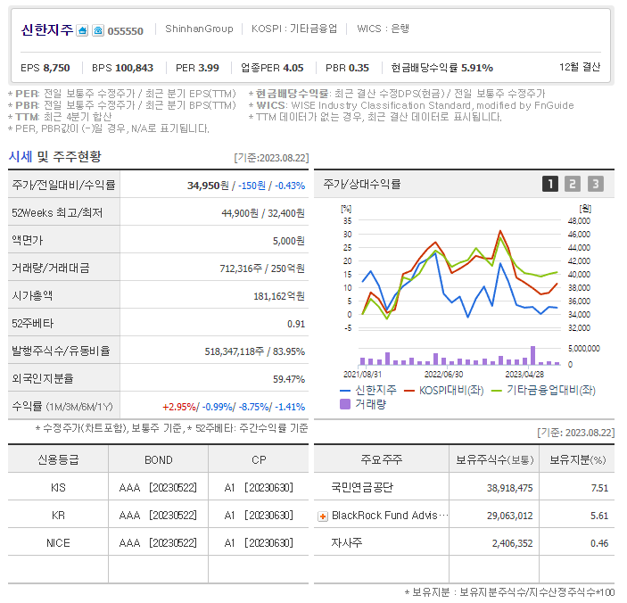 신한지주 현재 주가는 34,950원이며 전일 대비 -150원의 모습을 보이고 있습니다. 신한지주의 주주현황을 살펴보면 BlackRock Fund Advisors(외 13인)이 지분 7.51%를 소유하고 있습니다. 신한지주는 상업은행 기업으로 장중 기준으로 주가는 34,950원 입니다. 삼성전자의 시가 총액은 18조1681억 원이며 발행 주식수는 59.47주 입니다. 외국인 보유 비중은 712,316% 이며 장중 거래량은 518,347,118를 기록했습니다. 매출액은 25,738억 원, 영업이익은 억 원을 달성했습니다. EPS는 8,977원이며 신한지주 주식 배당수익률은 5.87% 입니다.