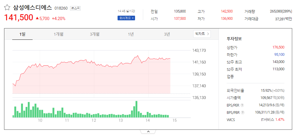 삼성에스디에스 현재 주가는 135,800원이며 전일 대비 원의 모습을 보이고 있습니다. 삼성에스디에스의 주주현황을 살펴보면 삼성전자(외 9인)이 지분 50.85%를 소유하고 있습니다. 삼성에스디에스는 IT 서비스 기업으로 장중 기준으로 주가는 135,800원 입니다. 삼성전자의 시가 총액은 10조9567억 원이며 발행 주식수는 15.92주 입니다. 외국인 보유 비중은 91,564% 이며 장중 거래량은 77,377,800를 기록했습니다. 매출액은 66,917억 원, 영업이익은 9,161억 원을 달성했습니다. EPS는 9,746원이며 삼성에스디에스 주식 배당수익률은 2.60% 입니다.