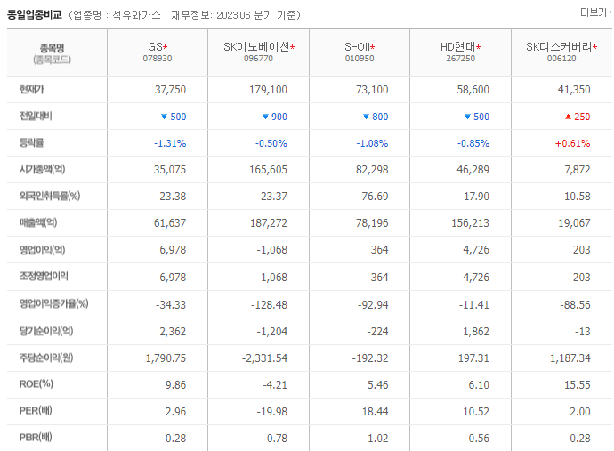 GS 현재 주가는 38,250원이며 전일 대비 -50원의 모습을 보이고 있습니다. GS의 주주현황을 살펴보면 허창수(외 56인)이 지분 52.83%를 소유하고 있습니다. GS는 석유 및 가스 기업으로 장중 기준으로 주가는 38,250원 입니다. 삼성전자의 시가 총액은 3조5076억 원이며 발행 주식수는 23.38주 입니다. 외국인 보유 비중은 77,070% 이며 장중 거래량은 92,915,378를 기록했습니다. 매출액은 130,002억 원, 영업이익은 50,051억 원을 달성했습니다. EPS는 12,452원이며 GS 주식 배당수익률은 0.95% 입니다.