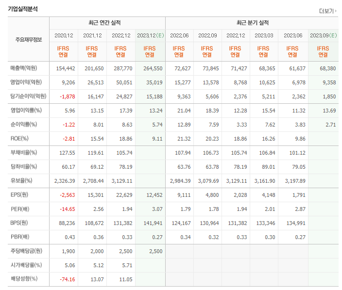 -2023년 3월 전년동기 대비 연결기준 매출액은 1.8% 감소, 영업이익은 14.2% 감소, 당기순이익은 38% 감소. 1분기 순이익은 전분기보다 감소했으나 최근 5분기 연속 영업이익 1조원 수준을 달성하며 높은 이익 안정성을 보여주고 있음. 기존 사업의 안정적인 현금창출 능력을 바탕으로 리사이클, 전기차, 배터리, 친환경 등을 핵심 성장사업군으로 선정해 적극적으로 역량을 확대하고 있음.