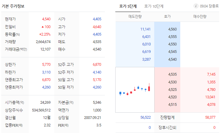 팬오션 현재 주가는 4,440원이며 전일 대비 -20원의 모습을 보이고 있습니다. 팬오션의 주주현황을 살펴보면 하림지주(외 10인)이 지분 54.77%를 소유하고 있습니다. 팬오션는 해상운수 기업으로 장중 기준으로 주가는 4,440원 입니다. 삼성전자의 시가 총액은 2조4269억 원이며 발행 주식수는 14.79주 입니다. 외국인 보유 비중은 1,655,346% 이며 장중 거래량은 534,569,512를 기록했습니다. 매출액은 22,212억 원, 영업이익은 7,896억 원을 달성했습니다. EPS는 823원이며 팬오션 주식 배당수익률은 2.62% 입니다.