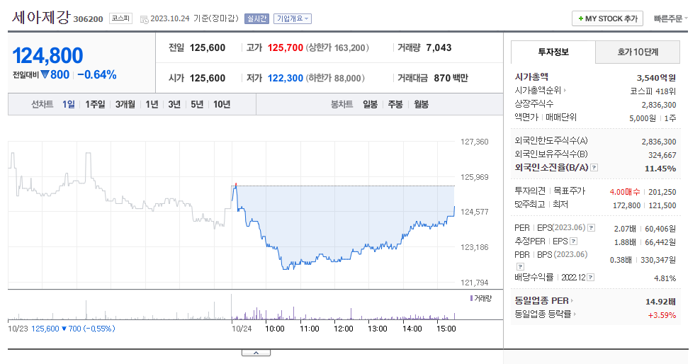 세아제강 현재 주가는 125,600원이며 전일 대비 -700원의 모습을 보이고 있습니다. 세아제강의 주주현황을 살펴보면 세아제강지주(외 7인)이 지분 62.76%를 소유하고 있습니다. 세아제강는 금속 및 광물 기업으로 장중 기준으로 주가는 125,600원 입니다. 시가 총액은 3517억 원이며 발행 주식수는 11.45주 입니다. 외국인 보유 비중은 4,785% 이며 장중 거래량은 2,836,300를 기록했습니다. 매출액은 10,001억 원, 영업이익은 2,152억 원을 달성했습니다. EPS는 66,407원이며 세아제강 주식 배당수익률은 4.63% 입니다.