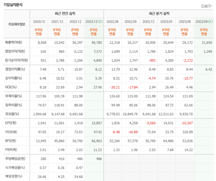 -2023년 6월 전년동기 대비 연결기준 매출액은 113.4% 증가, 영업이익은 57.6% 증가, 당기순이익은 33.8% 증가. 전기차 시장 확대 효과로 전년동기대비 매출이 113% 가까이 올랐고 이에 따른 부수적인 효과로 영업이익이 60% 가까이 증가함. 동사는 실적대비 주가가 매우 상승세를 탔으며 한 때 100만원을 넘어서기도 했음. 증권가에서는 다소 고평가됐다는 이야기가 나오기도 함.