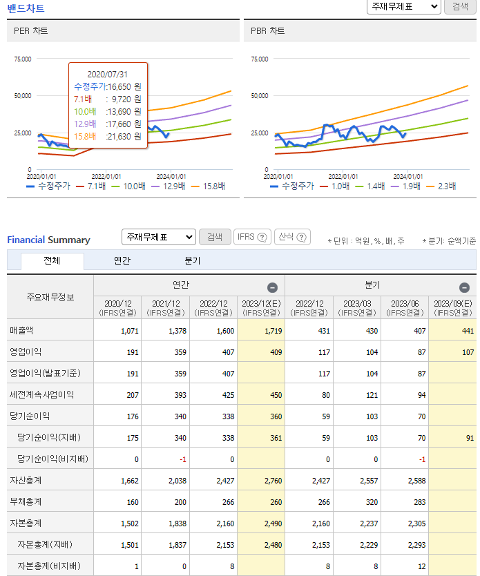 -2023년 6월 전년동기 대비 연결기준 매출액은 7.3% 증가, 영업이익은 10.7% 감소, 당기순이익은 6.9% 감소. 매출액이 소폭 증가하였으나 매출원가, 판관비, 인건비 등의 비용 증가로 영업이익은 소폭 감소함. 성분분석은 진단 및 예방의학 측면에서의 활용도가 높아 인바디에 대한 수요가 증가할 것으로 예상됨. 동사는 홈네트워크 시스템, U-헬스케어 시스템의 도입이 가시화됨에 따라 관련 산업 분야로의 진출을 모색하고 있음.