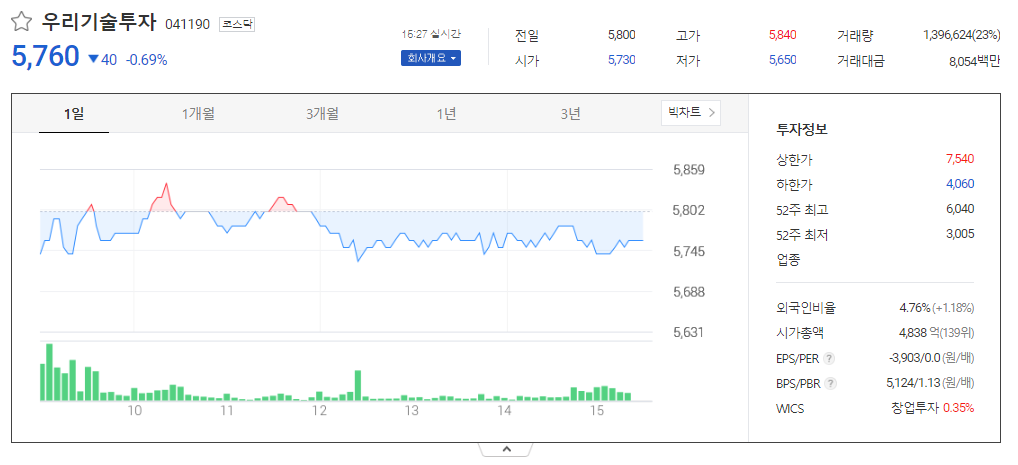 우리기술투자 현재 주가는 5,800원이며 전일 대비 원의 모습을 보이고 있습니다. 우리기술투자의 주주현황을 살펴보면 이완근(외 5인)이 지분 30.91%를 소유하고 있습니다. 우리기술투자는 창업투자 및 종금 기업으로 장중 기준으로 주가는 5,800원 입니다. 우리기술투자 시가 총액은 4838억 원이며 발행 주식수는 4.76주 입니다. 외국인 보유 비중은 5,868,447% 이며 장중 거래량은 84,000,000를 기록했습니다. 매출액은 5억 원, 영업이익은 억 원을 달성했습니다. \우리기술투자 주식 배당수익률은 -4,301% 입니다.