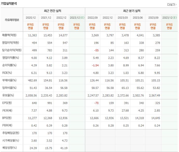 -2023년 6월 전년동기 대비 연결기준 매출액은 12% 증가, 영업이익은 87.9% 증가, 당기순이익은 160.9% 증가. 건설사업 수익성 악화에도 불구하고 레미콘 사업 외형 성장과 원가율 개선에 힘입어 영업이익이 큰폭으로 성장함. 세전계속사업이익 반영되며 당기순이익도 대폭 증가. 동사의 레미콘 부문은 건설현장의 기초를 좌우하는 중요한 상품임을 감안, 전직원의 영업사원화를 통하여 매출극대화에 주력함.