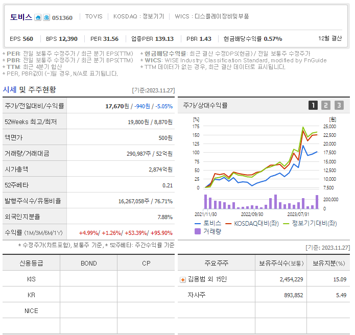 토비스 현재 주가는 17,670원이며 전일 대비 -940원의 모습을 보이고 있습니다. 토비스의 주주현황을 살펴보면 김용범(외 15인)이 지분 15.09%를 소유하고 있습니다. 토비스는 디스플레이 및 관련부품 기업으로 장중 기준으로 주가는 17,670원 입니다. 토비스 시가 총액은 2842억 원이며 발행 주식수는 7.88주 입니다. 외국인 보유 비중은 290,987% 이며 장중 거래량은 16,267,058를 기록했습니다. 매출액은 3,189억 원, 영업이익은 70억 원을 달성했습니다. EPS는 1,327원이며 토비스 주식 배당수익률은 2,874% 입니다.