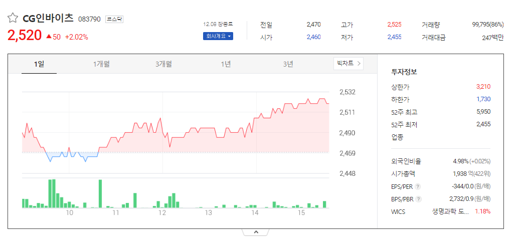 CG인바이츠 현재 주가는 2,470원이며 전일 대비 -75원의 모습을 보이고 있습니다. CG인바이츠의 주주현황을 살펴보면 조중명(외 3인)이 지분 10.78%를 소유하고 있습니다. CG인바이츠는 바이오 기업으로 장중 기준으로 주가는 2,470원 입니다. CG인바이츠 시가 총액은 1938억 원이며 발행 주식수는 4.98주 입니다. 외국인 보유 비중은 115,479% 이며 장중 거래량은 76,894,182를 기록했습니다. 매출액은 185억 원, 영업이익은 -241억 원을 달성했습니다. CG인바이츠 주식 배당수익률은 1.00% 입니다.