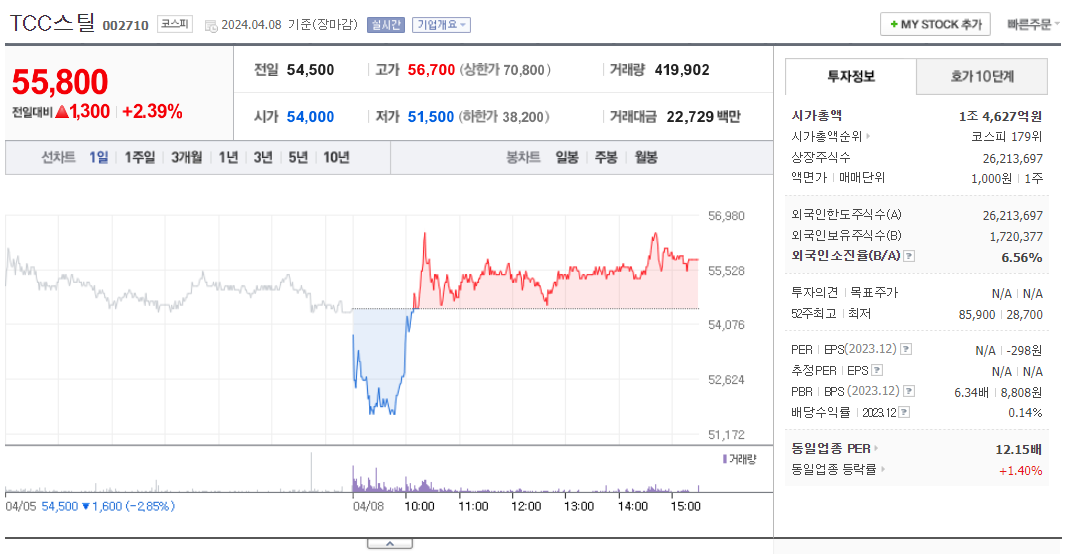 TCC스틸는 금속 및 광물 기업입니다. 대표자는 손봉락, 조석희, 손기영 (각자대표) 이며 설립일은 1959/07/16, 주식 상장일은 1984/12/21입니다. 전체 종업원 수는277명 이고 본사 주소는 경북 포항시 남구 괴동로 100 (장흥동)입니다.