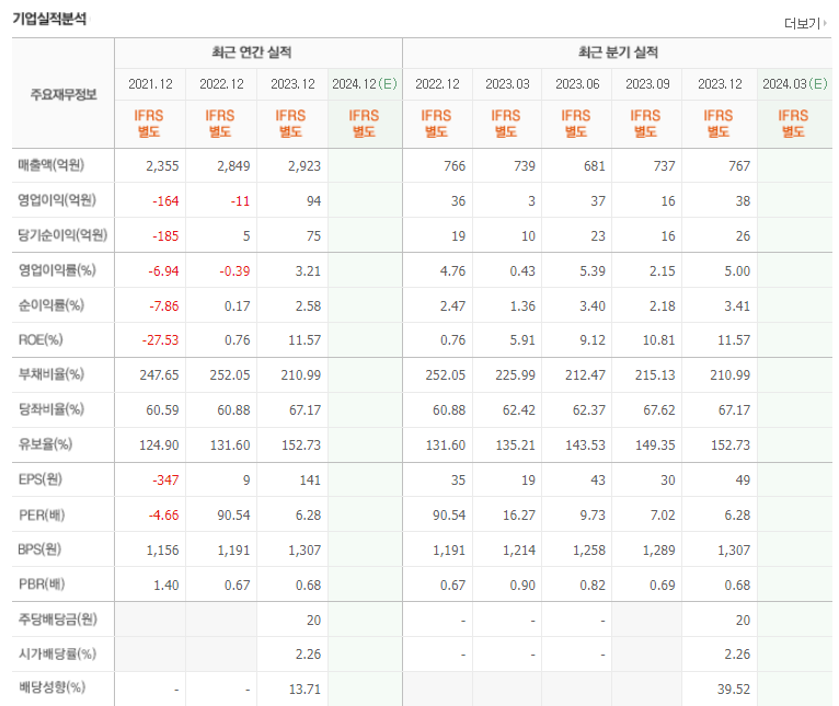 -2023년 9월 전년동기 대비 별도기준 매출액은 3.6% 증가, 영업이익 흑자전환, 당기순이익 흑자전환. 코로나19로 인한 기저효과와 전방산업 개선 영향으로 외형 확대되었으며, 원가율 하락 및 각종 비용등의 감소로 수익성 크게 개선되며 흑자 전환에 성공. 시장환경은 비교적 우호적이며, 원재료인 고철 및 코크스, 선철의 가격이 하향 안정됨에 따라 추가적인 실적 개선도 가능할 것으로 기대.
