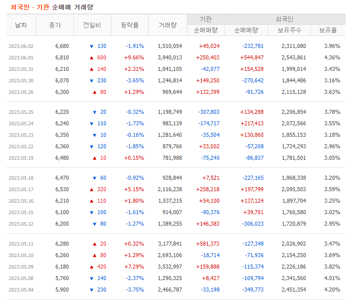 이중에 가장 좋은 것은 외국인과 기관이 같이 매수하는 쌍끌이 종목을 찾아서 투자하는 것입니다. 외국인과 기관이 같이 매수한다는 것은 투자하기 좋다는 뜻입니다. 주가 전망을 알아보려면 먼저 기업체를 분석하고 시장 흐름에서의 위치를 확인해야 합니다. 거기에 외국인과 기관 매수 흐름을 확인한다면 투자에 있어서 확률을 올리는 것이 가능합니다.