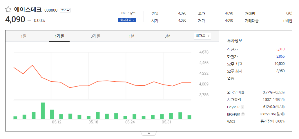 에이스테크 현재 주가는 4,090원이며 전일 대비 -5.10원의 모습을 보이고 있습니다. 에이스테크의 주주현황을 살펴보면 구관영(외 7인)이 지분 16.99%를 소유하고 있습니다. 에이스테크는 통신장비 기업으로 장중 기준으로 주가는 4,090원 입니다. 삼성전자의 시가 총액은 1837억 원이며 발행 주식수는 3.77주 입니다. 외국인 보유 비중은 182,171% 이며 장중 거래량은 44,926,073를 기록했습니다. 매출액은 446억 원, 영업이익은 -201억 원을 달성했습니다.