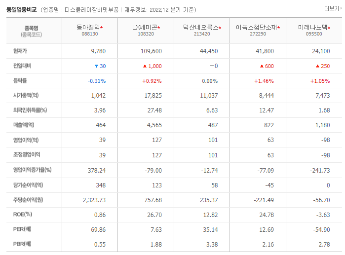 동아엘텍 현재 주가는 9,810원이며 전일 대비 -90원의 모습을 보이고 있습니다. 동아엘텍의 주주현황을 살펴보면 박재규(외 3인)이 지분 31.01%를 소유하고 있습니다. 동아엘텍는 디스플레이 및 관련부품 기업으로 장중 기준으로 주가는 9,810원 입니다. 삼성전자의 시가 총액은 1043억 원이며 발행 주식수는 3.96주 입니다. 외국인 보유 비중은 51,716% 이며 장중 거래량은 10,662,938를 기록했습니다. 매출액은 2,138억 원, 영업이익은 56억 원을 달성했습니다. EPS는 없음원이며 동아엘텍 주식 배당수익률은 % 입니다.