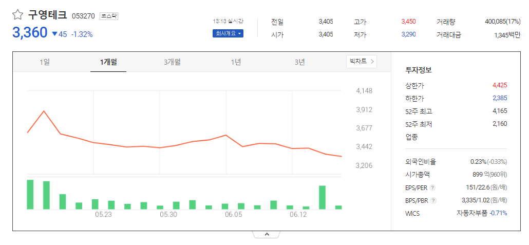 구영테크 현재 주가는 3,405원이며 전일 대비 -75원의 모습을 보이고 있습니다. 구영테크의 주주현황을 살펴보면 이희화(외 5인)이 지분 43.74%를 소유하고 있습니다. 구영테크는 자동차부품 기업으로 장중 기준으로 주가는 3,405원 입니다. 삼성전자의 시가 총액은 899억 원이며 발행 주식수는 0.23주 입니다. 외국인 보유 비중은 2,317,403% 이며 장중 거래량은 26,758,328를 기록했습니다. 매출액은 880억 원, 영업이익은 77억 원을 달성했습니다. EPS는 없음원이며 구영테크 주식 배당수익률은 % 입니다.