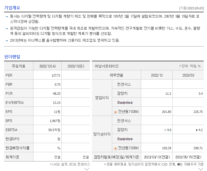 -동사는 디지털 전력량계 및 디지털 계량기 제조 및 판매를 목적으로 1997년 2월 17일에 설립되었으며, 2007년 9월 19일자로 코스닥시장에 상장됨. 원격검침이 가능한 디지털 전력량계를 국내 최초로 개발하였으며, 지속적인 연구개발로 전기를 비롯한 가스, 수도, 온수, 열량계 등의 설비미터도 디지털 방식으로 개발한 계측기 분야를 선도함. 2013년에는 이너렉스를 흡수합병하여 신용카드 제조업도 영위하고 있음.