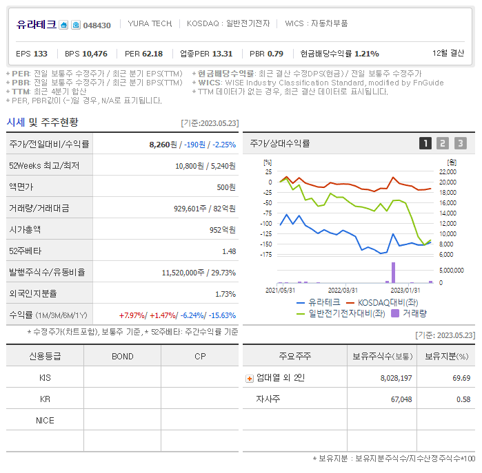 유라테크 현재 주가는 8,260원이며 전일 대비 -190원의 모습을 보이고 있습니다. 유라테크의 주주현황을 살펴보면 엄대열(외 2인)이 지분 69.69%를 소유하고 있습니다. 유라테크는 자동차부품 기업으로 장중 기준으로 주가는 8,260원 입니다. 삼성전자의 시가 총액은 949억 원이며 발행 주식수는 1.73주 입니다. 외국인 보유 비중은 929,601% 이며 장중 거래량은 11,520,000를 기록했습니다. 매출액은 513억 원, 영업이익은 -4억 원을 달성했습니다. EPS는 없음원이며 유라테크 주식 배당수익률은 6% 입니다.