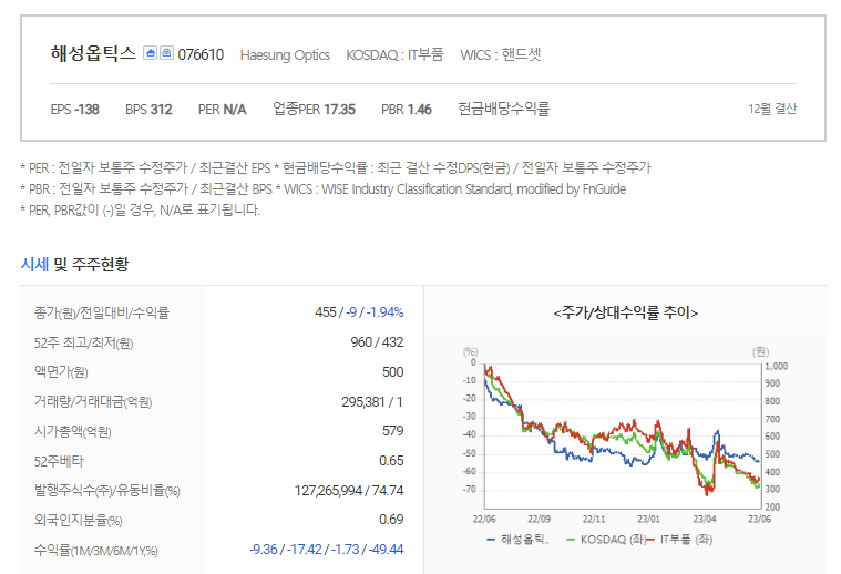 해성옵틱스 현재 주가는 455원이며 전일 대비 -9원의 모습을 보이고 있습니다. 해성옵틱스의 주주현황을 살펴보면 얼머스인베스트먼트(외 1인)이 지분 25.14%를 소유하고 있습니다. 해성옵틱스는 휴대폰 및 관련부품 기업으로 장중 기준으로 주가는 455원 입니다. 삼성전자의 시가 총액은 580억 원이며 발행 주식수는 0.69주 입니다. 외국인 보유 비중은 295,381% 이며 장중 거래량은 127,265,994를 기록했습니다. 매출액은 239억 원, 영업이익은 -51억 원을 달성했습니다. 해성옵틱스 주식 배당수익률은 -114% 입니다.