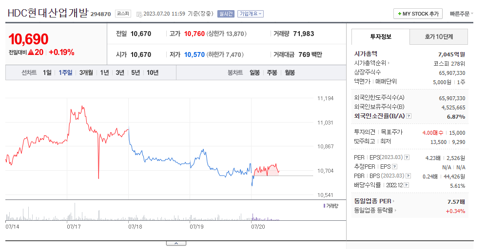 HDC현대산업개발 현재 주가는 10,670원이며 전일 대비 -90원의 모습을 보이고 있습니다. HDC현대산업개발의 주주현황을 살펴보면 HDC(외 7인)이 지분 43.01%를 소유하고 있습니다. HDC현대산업개발는 건설 기업으로 장중 기준으로 주가는 10,670원 입니다. 시가 총액은 7072억 원이며 발행 주식수는 6.87주 입니다. 외국인 보유 비중은 176,727% 이며 장중 거래량은 65,907,330를 기록했습니다. 매출액은 10,749억 원, 영업이익은 1,164억 원을 달성했습니다. EPS는 1,614원이며 HDC현대산업개발 주식 배당수익률은 6.00% 입니다.
