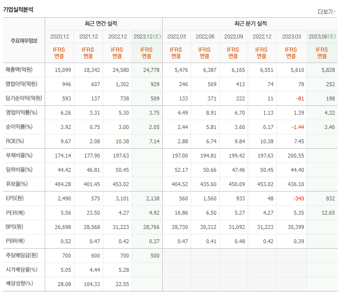 -2023년 3월 전년동기 대비 연결기준 매 출액은 2.4% 증가, 영업이익은 68.4% 감소, 당기순이익 적자전환. 동사의 매출액은 전년 동기 대비 소폭 증가했지만, 매출원가가 더 큰 폭으로 확대되면서 영업이익이 전년 동기 대비 큰 폭으로 감소함. 기타수익 및 금융수익이 전년 동기 대비 증가했지만 금융비용이 큰 폭으로 증가히야 동사의 당기순이익은 적자로 전환됨.