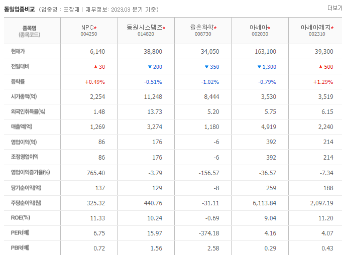 NPC 현재 주가는 6,110원이며 전일 대비 -80원의 모습을 보이고 있습니다. NPC의 주주현황을 살펴보면 임익성(외 15인)이 지분 58.05%를 소유하고 있습니다. NPC는 용기 및 포장 기업으로 장중 기준으로 주가는 6,110원 입니다. NPC의 시가 총액은 2247억 원이며 발행 주식수는 1.48주 입니다. 외국인 보유 비중은 217,243% 이며 장중 거래량은 36,720,000를 기록했습니다. 매출액은 1,269억 원, 영업이익은 235억 원을 달성했습니다. NPC 주식 배당수익률은 13.64% 입니다.