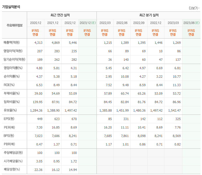 -2023년 3월 전년동기 대비 연결기준 매출액은 4.4% 증가, 영업이익은 30.3% 증가, 당기순이익은 281.2% 증가. 매출은 주력제품의 내수 및 수출 동반 확대로 증가세를 나타냈으며, 원자재 가격의 소폭 하락 영향으로 영업수익성은 비교적 큰 폭의 상승세를 시현함. 플라스틱 산업의 긍정적 전망과 함께 꾸준한 매출활동 및 대체품 개발 등으로 지속적으로 성장할 것으로 기대함.